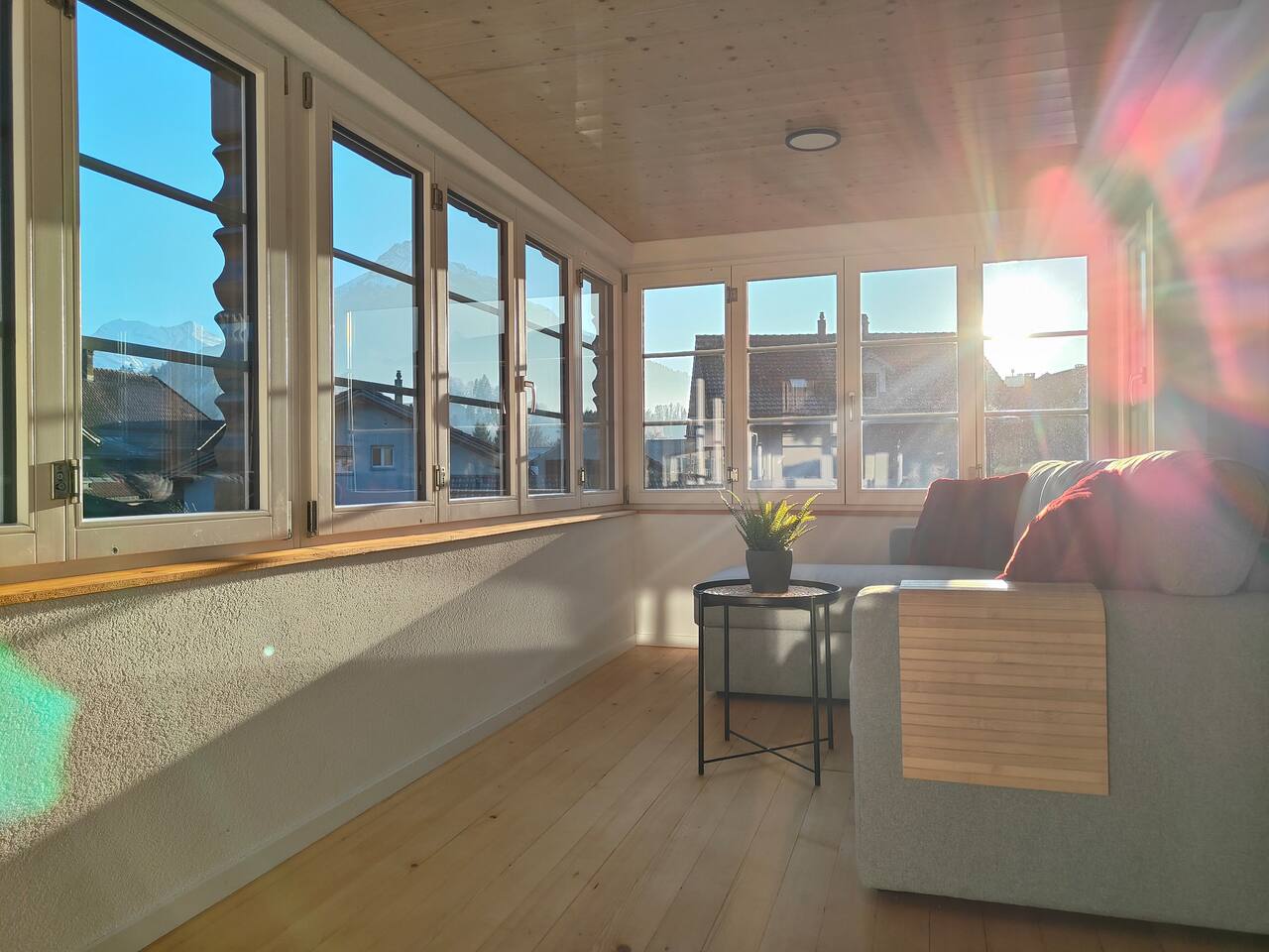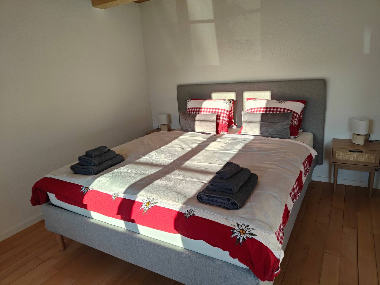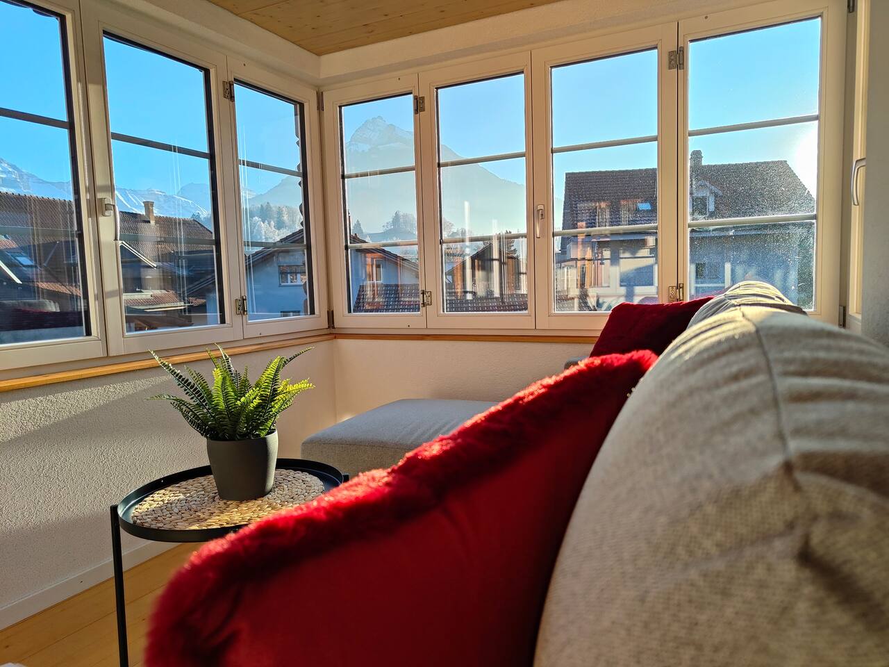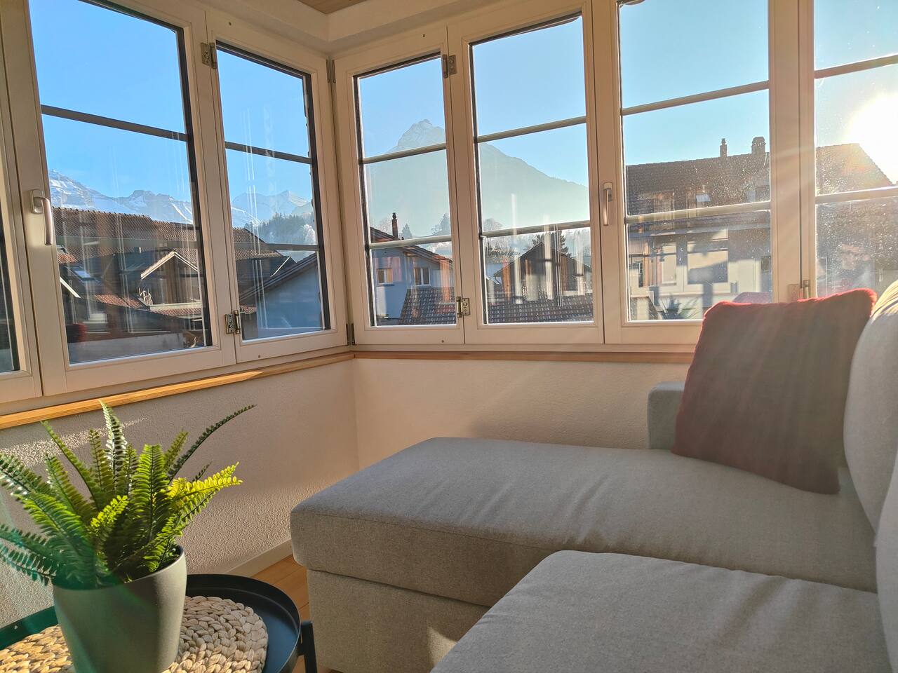 Du wirst den Ausblick lieben und kannst deinen Tag mit einem Nespresso-Kaffee auf dem Balkon starten, wie keinen anderen. Das Apartment ist sehr hochwertig eingerichtet und verfügt über ein bequemes Kingsize-Bett (1,80 breit), Queensize-Bett (1,60m breit) , Sofa-Bett, einen Smart-TV und einer voll ausgestatteten Küche mit Herdplatten, Kühlschrank und allem was man braucht. Das neu renovierte Badezimmer verfügt über eine Dusche und einer Waschmashine sowie ein Trockner. Selbstverständlich stellen wir frische Handtücher und Badezimmer-Essentials bereit. Leider fehlt im Moment der Schlüssel zür Badzimmertüre und wir schauen wie wir ihn ersetzen können. Die Lage des Apartments ist ideal: Du kannst dich auf Ausflüge nach Interlaken, Spaziergänge und Skiferien im Berner Oberland freuen.